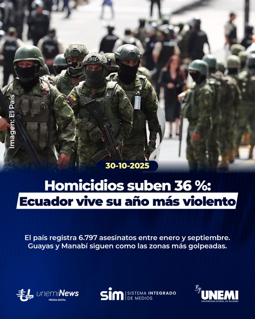 Ecuador atraviesa una de las crisis de seguridad más graves de su historia reciente. Entre enero y septiembre de 2025 se registraron 6.797 homicidios intencionales, lo que representa un aumento del 36 % en comparación con el mismo período del año anterior. Estas cifras posicionan a 2025 como el año más violento desde que existen registros oficiales del Ministerio del Interior.
