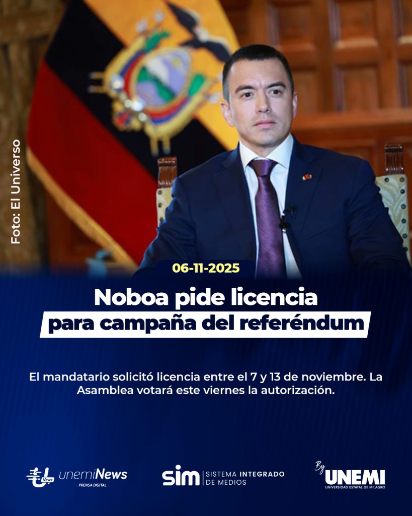 El presidente de la república, Daniel Noboa, formalizó su solicitud de licencia ante la Asamblea Nacional para participar activamente en la campaña del referéndum y consulta popular del próximo domingo 16 de noviembre de 2025.